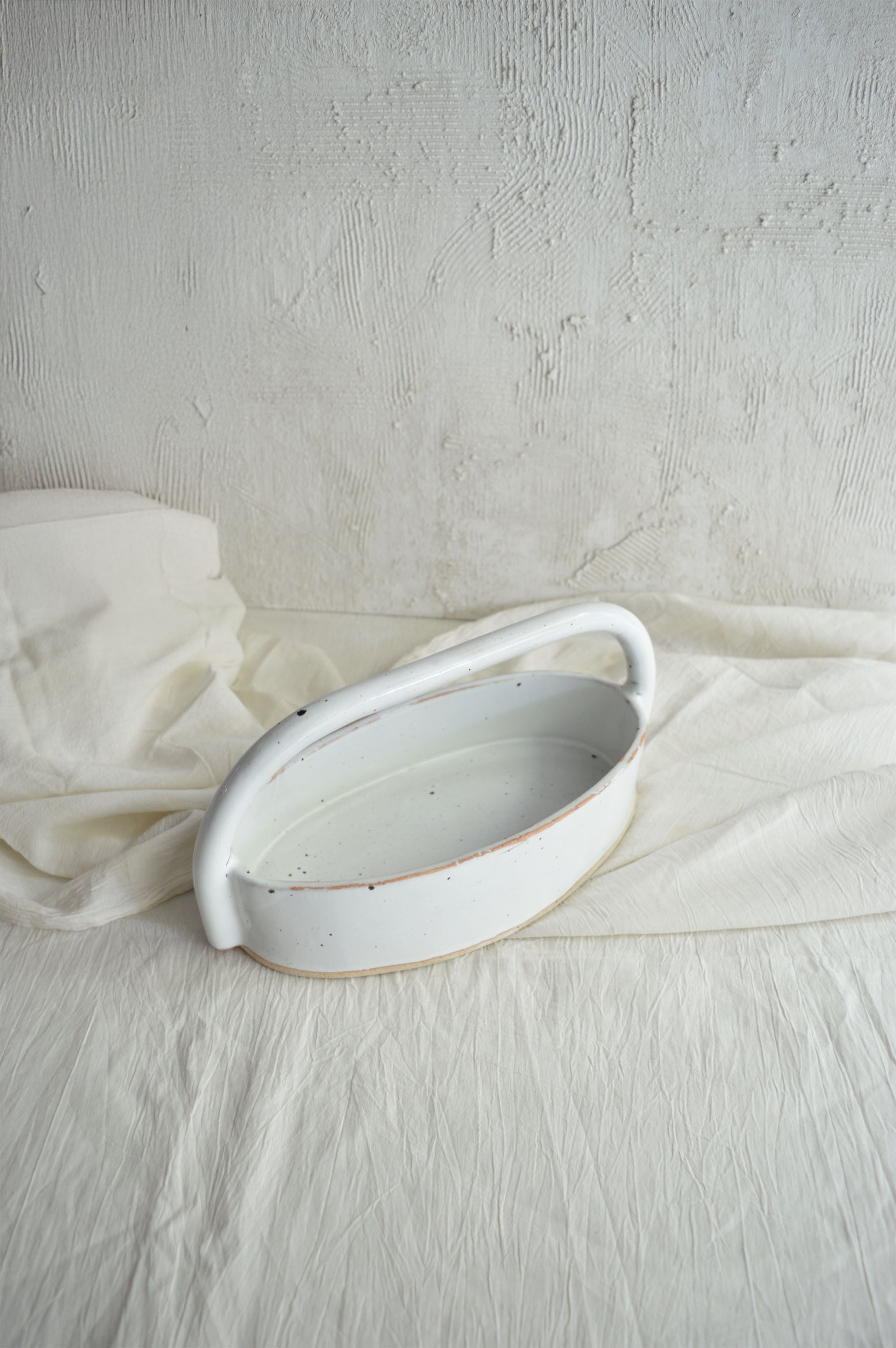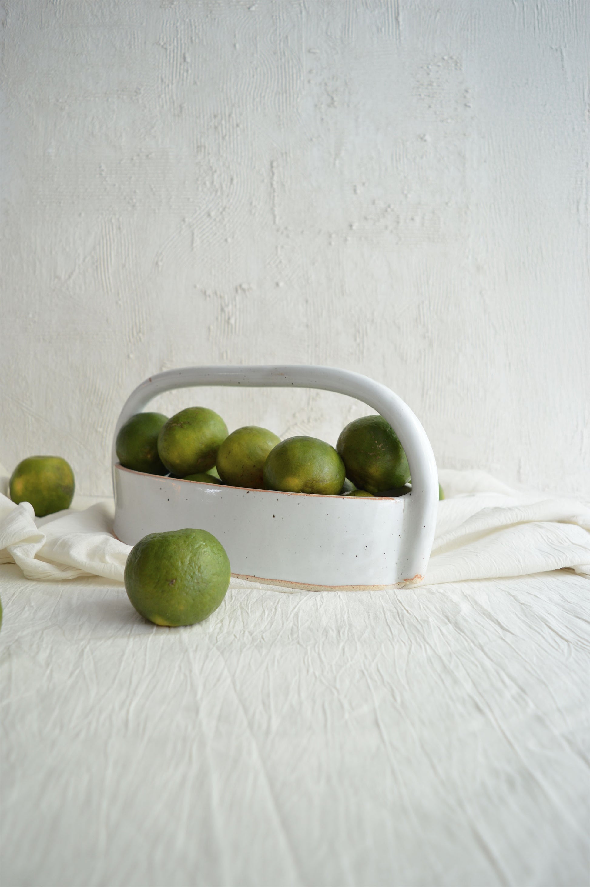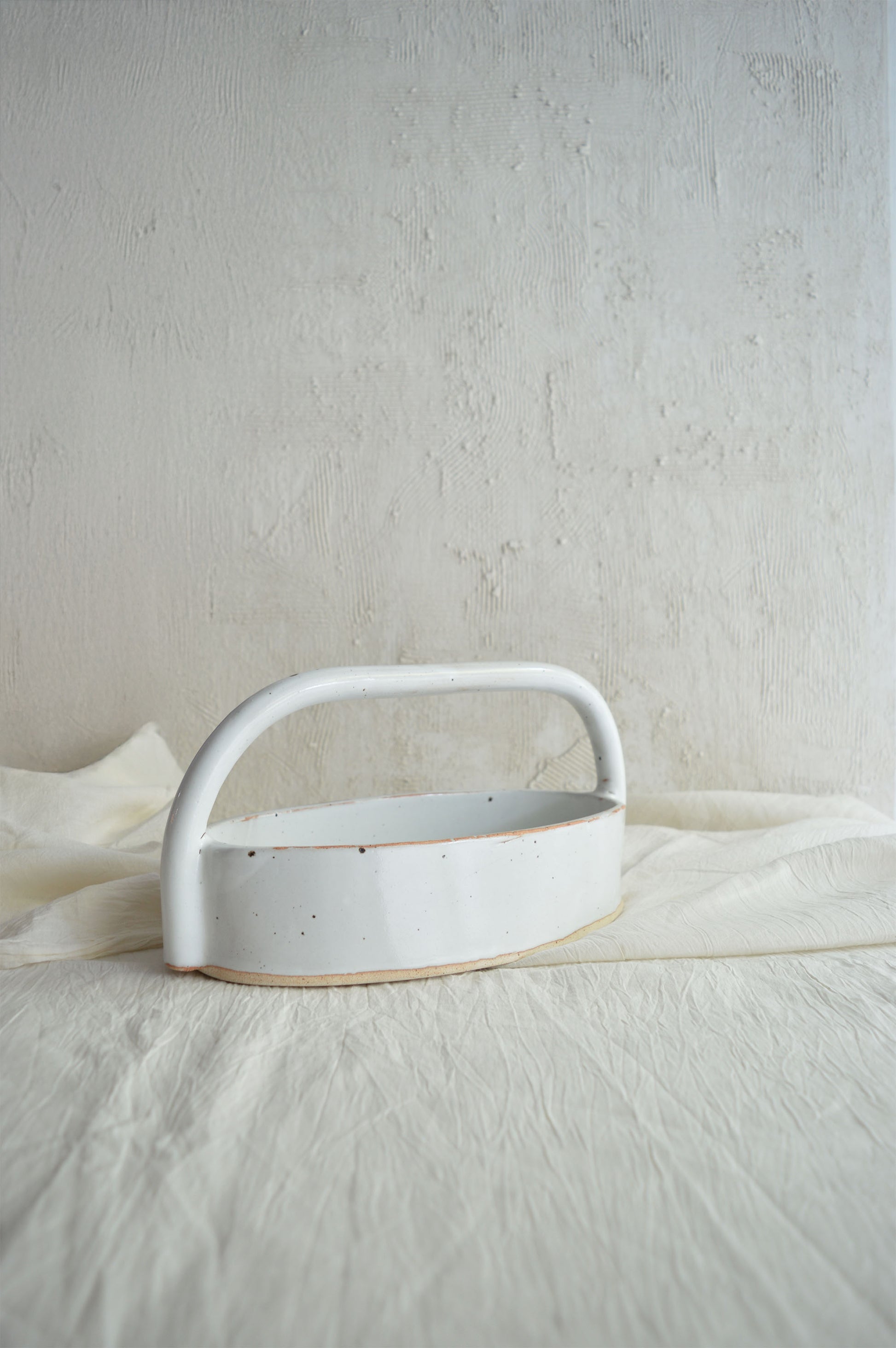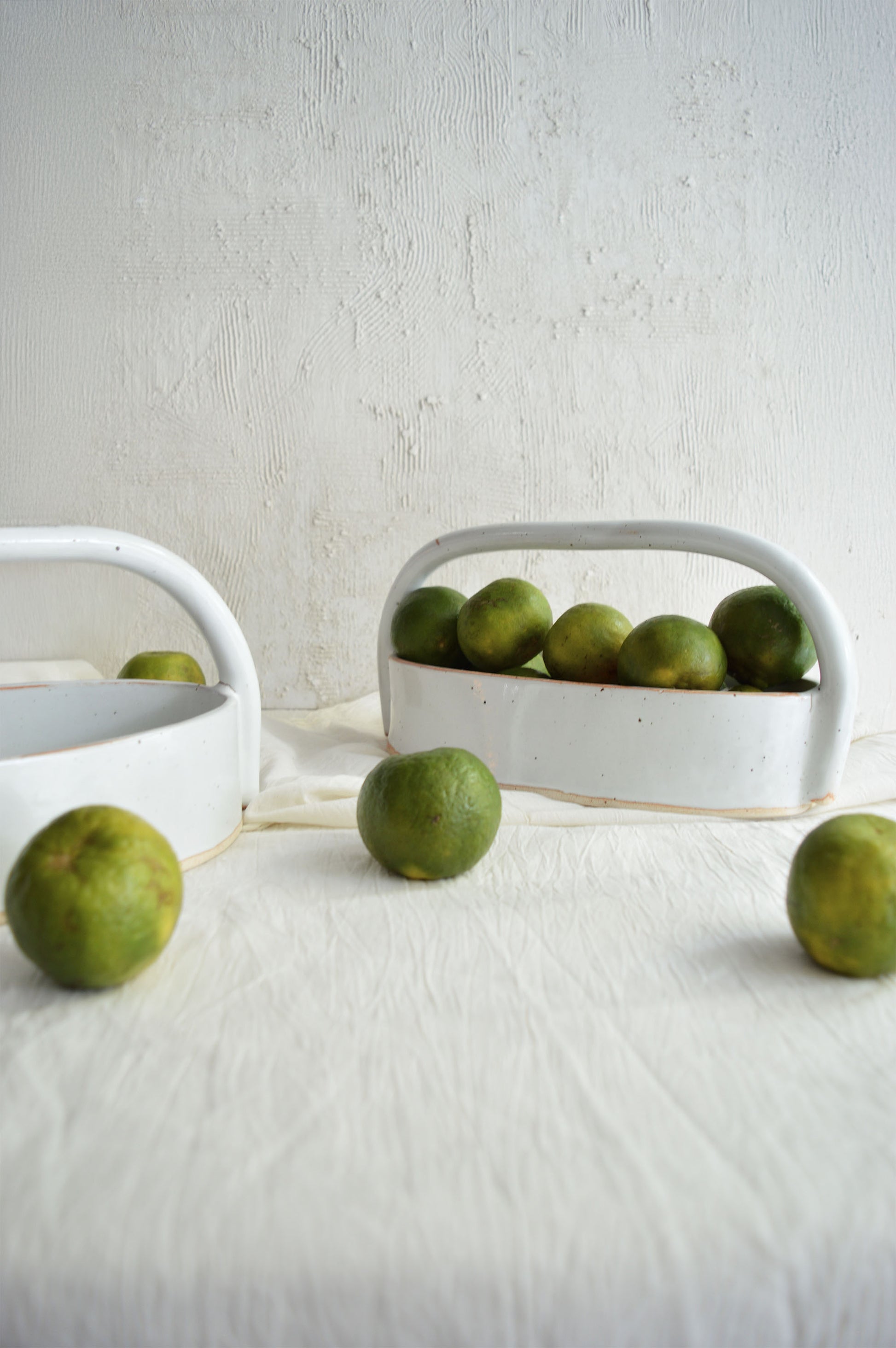 This hand-built ceramic basket is our modern interpretation of a traditional woven basket, reimagined through the medium of clay. Traditionally, baskets are crafted from natural materials, their delicate weaves representing functionality and art. We wanted to capture that same timeless essence but with the material we know best—ceramic. This basket is not only a statement piece for display but also versatile in its use. Its design celebrates the balance between craftsmanship and function, offering a unique, handcrafted alternative to the woven classic. Perfect for holding fruits, serving bread, or simply as a center-piece, it brings an artisanal touch to any space.
