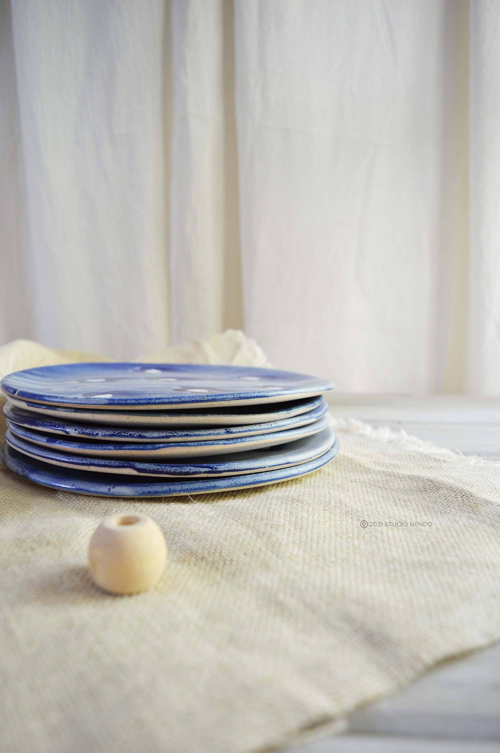 These irregular and organically shaped plates are hand-built by the artist with slabs of clay. Their size is somewhere between a quarter plate and a full-size dinner plate. There are no measurements involved while making these plates or an electric wheel. They are stunning, quirky pieces suitable for eclectic homes, for the lover of contemporary ceramics. Add a whole lot of charm and character to your tableware collection with these stunning plates. The top part of the plate is glazed in a beautiful silky smooth glossy, creamy glaze while the bottoms are left untouched and expose the beautiful colour of fired stoneware clay. A stunning contrast.